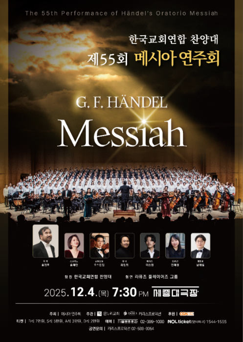 세종문화회관 대극장에서 60개의 교회와 300명의 연합찬양대 합창으로 진행된 <제55회 메시아 연주회>도 12월 25일(목) 저녁 6시 50분에 시청자들을 찾는다. 올해로 55회째 이어온 ‘메시아 연주회’는 최초의 개신교 연합합창이자 한국을 대표하는 합창음악의 효시로 평가받는다. 예수 탄생부터 부활까지를 담은 헨델(Georg Friedrich Händel)의 오라토리오 ‘메시아’, HWV 56를 합창하여 애수의 생애를 음악으로 펼쳐 보인다.