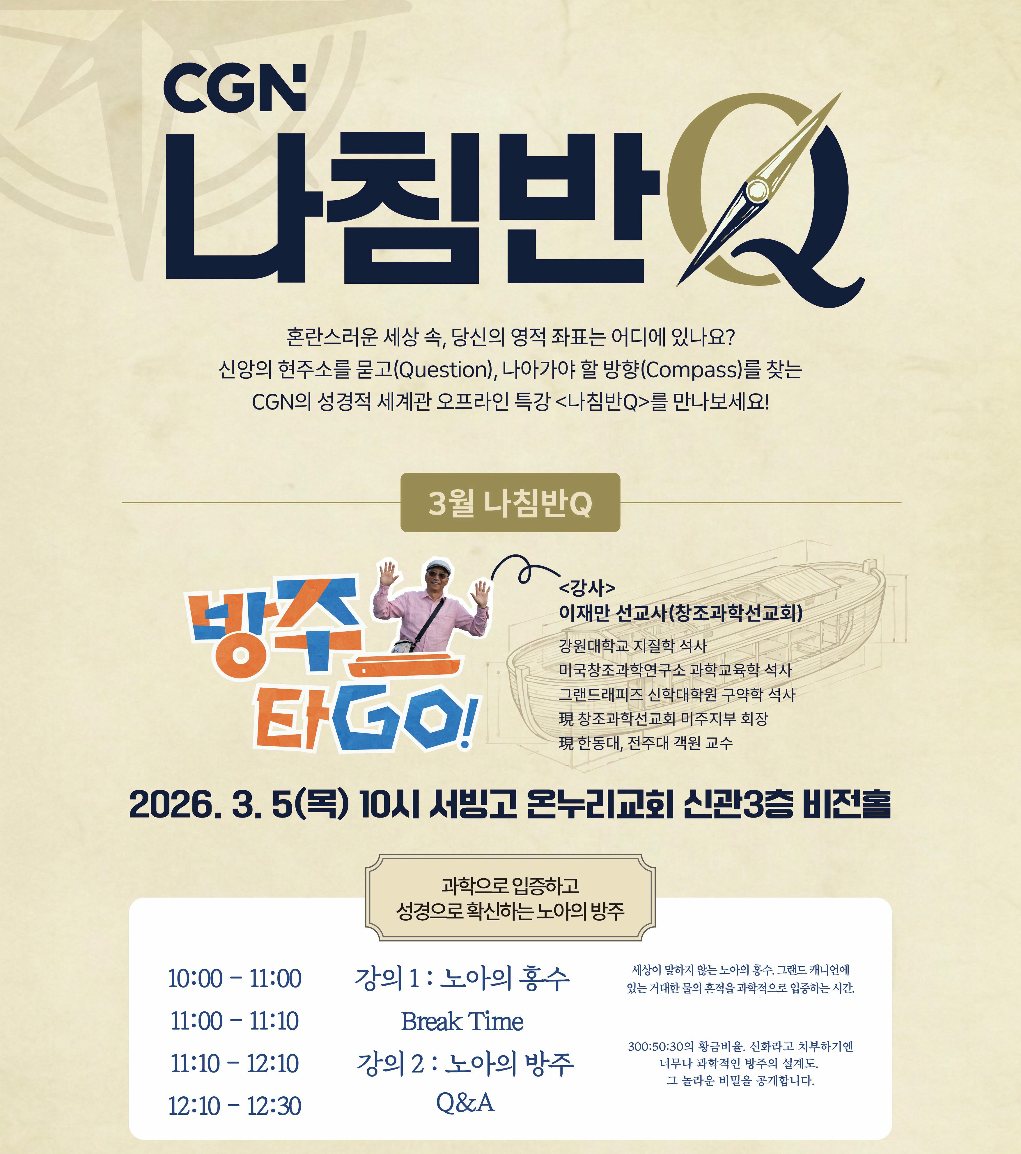 ‘나침반Q’ 첫 강의는 지난 3월 5일(목), 온누리교회(서빙고, 신관 3층 비전홀)에서 열렸습니다. CGN 콘텐츠 <방주타GO!>, <빙하의 일각> 등에 출연하여 창조과학을 쉽고 체계적으로 전해온 이재만 선교사(창조과학선교회)가 스타트를 끊었는데요.